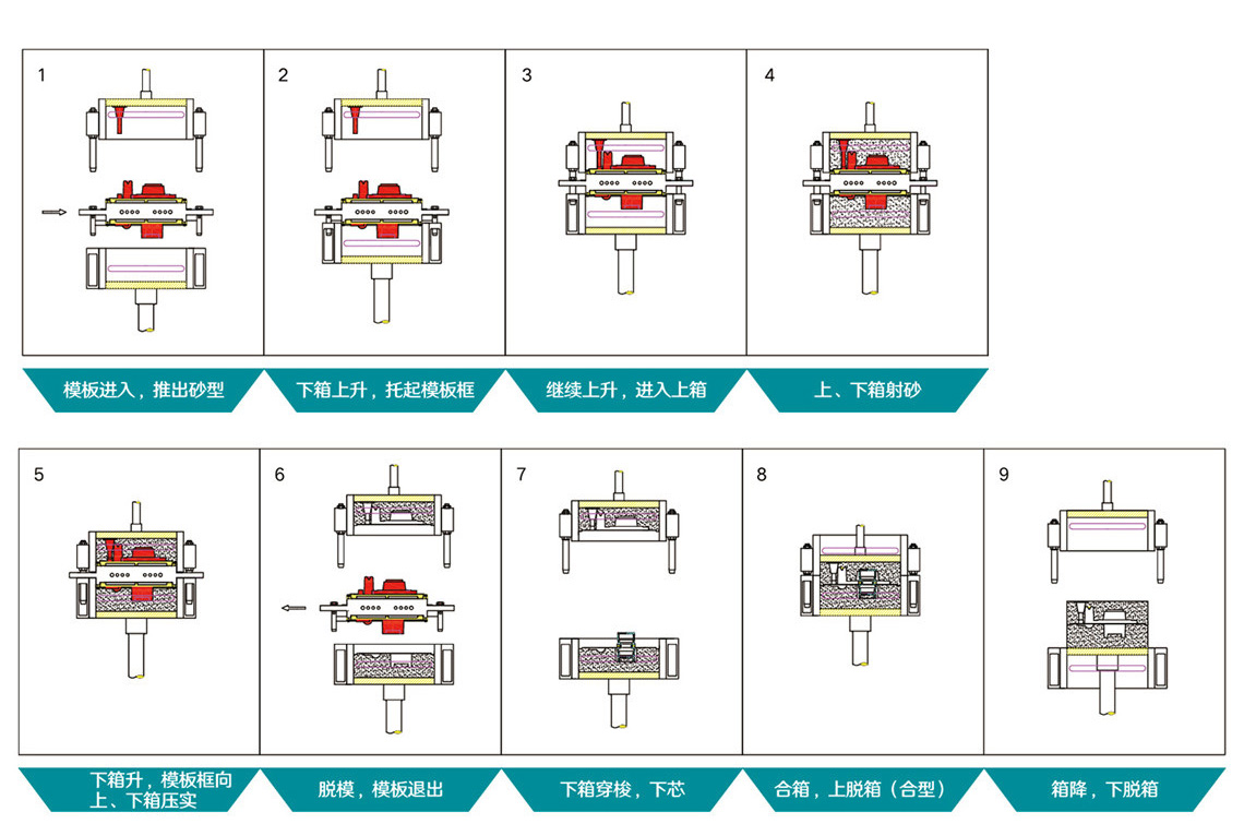 造型工序簡(jiǎn)單,無(wú)砂箱翻轉、回轉動(dòng)作,能耗低,造型動(dòng)作穩定、可靠